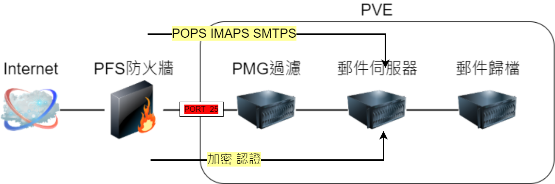 - 垃圾郵件隔離,使用者自行判斷是否下載,或黑白名單。