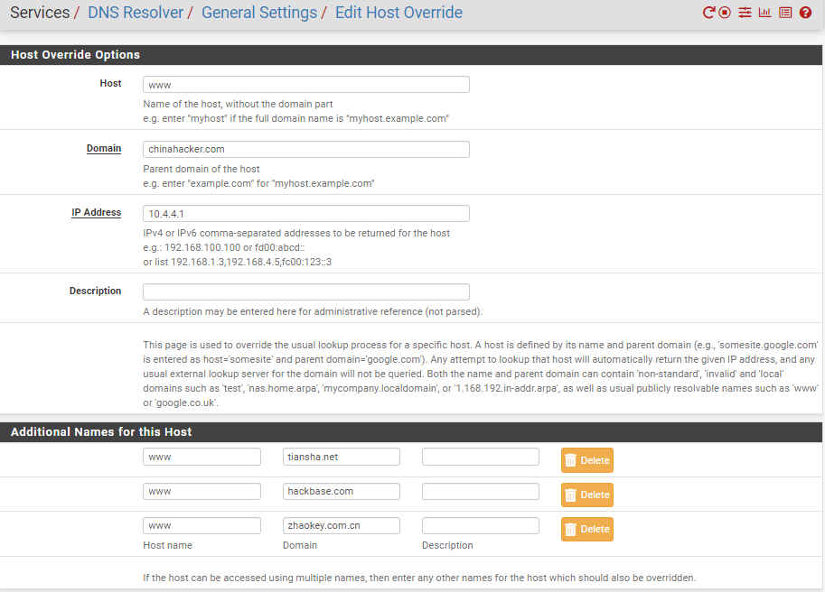 到 Services \ DNS Resolver 最底下 Host Overrides 新增主機