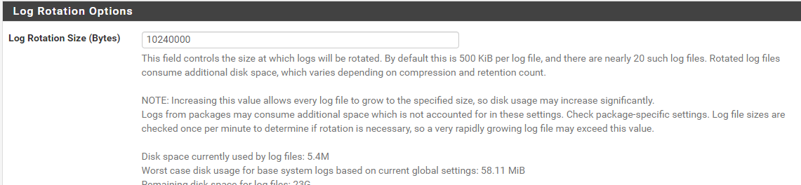 Log Rotation Size (Bytes) "10240000" \\設定log檔案大小為 10MB