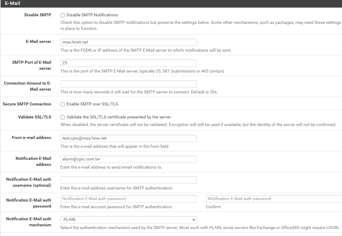 Notification E-Mail address "alarm@cpic.com.tw" - Networking