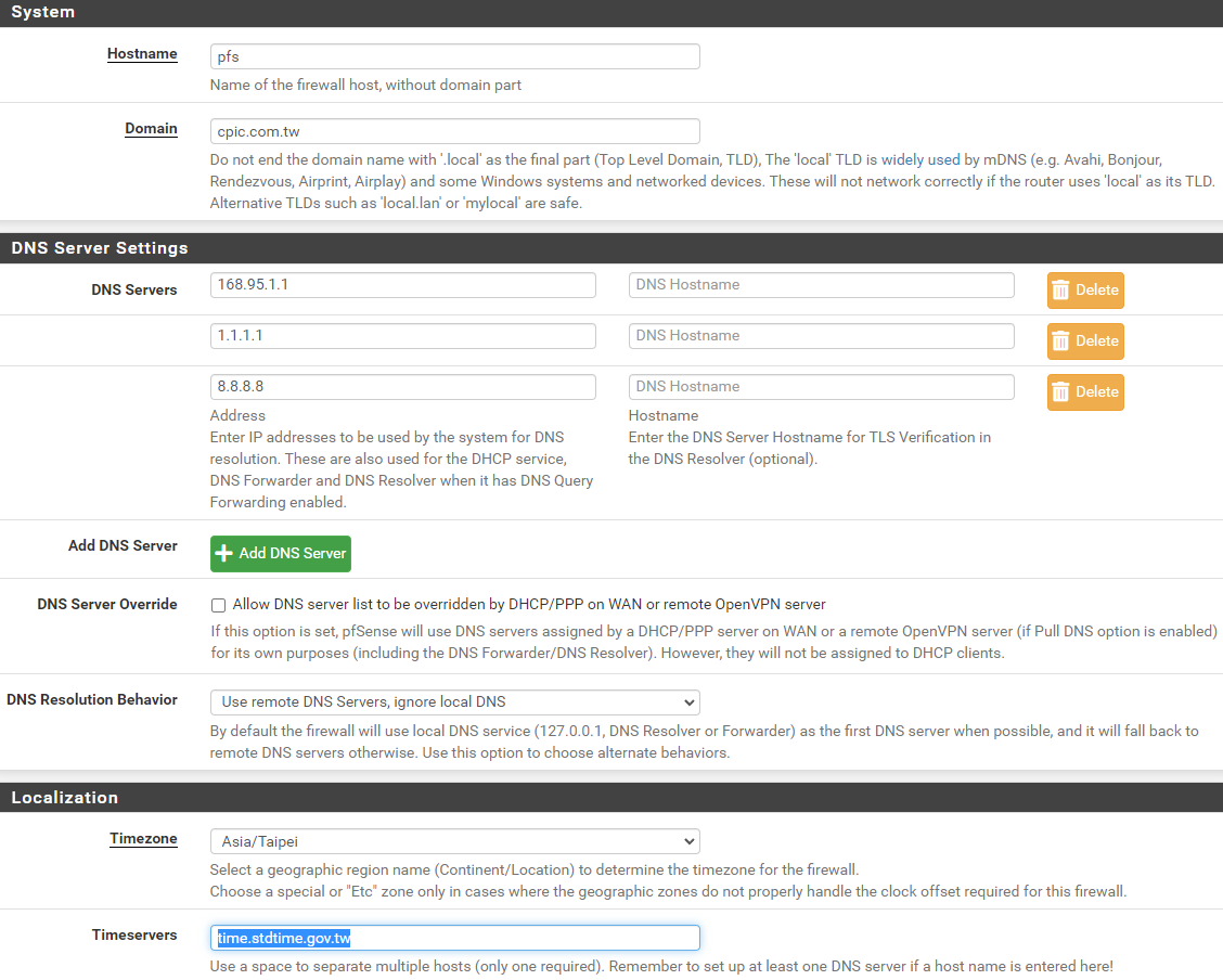 DNS Servers "1.1.1.1" "8.8.8.8" "168.95.1.1" \\DNS 可輸入多個